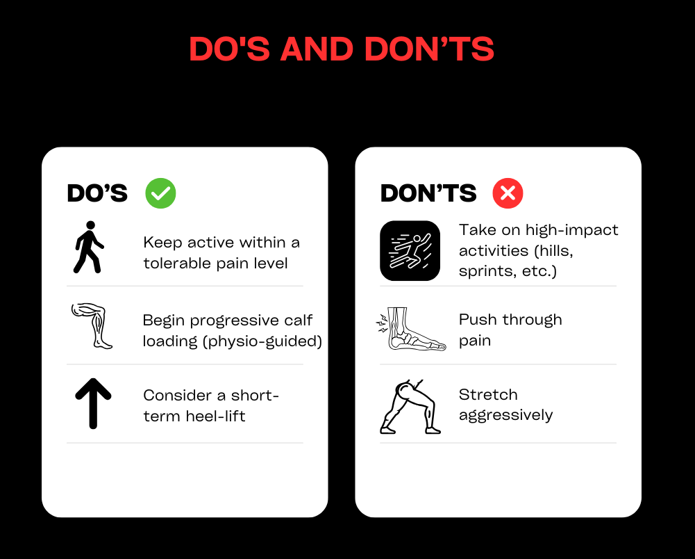 - Use temporary heel lifts or wear shoes with a slightly higher heel to reduce strain on the tendon in the early stages.