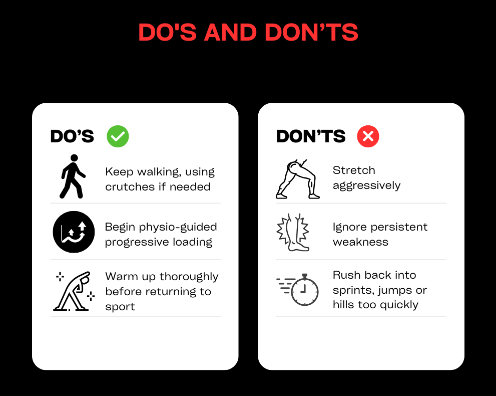 - Use ice or heat for short periods for symptom relief, and prioritise your overall training load management and sleep for better recovery.